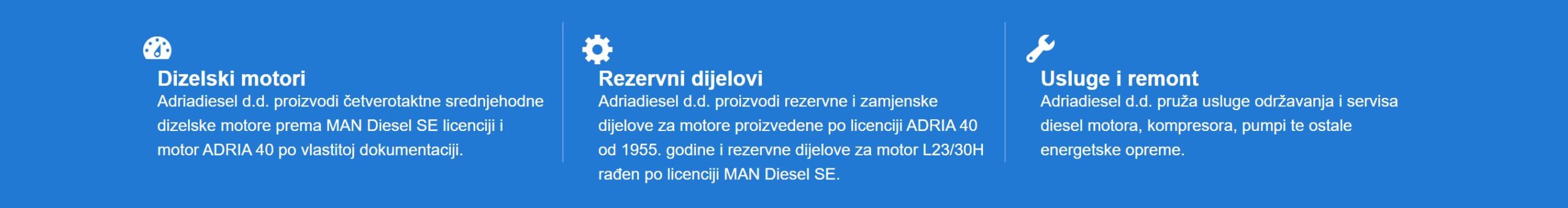 - – uklanjanje kvarova, održavanje, servis i popravak Adria 40, MAN i drugih dizelskih motora i drugih elektroenergetskih postrojenja